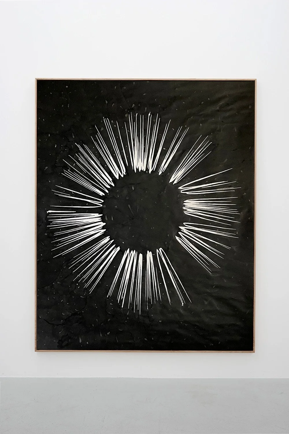 Franziska Furter produced the large-format ink drawing Every Breath You Take especially for the exhibition. It is one of a series of five drawings so far, all executed with a drawing pen. This is a device that was used especially by architects for technical drawings before Rotring pens made this writing instrument (almost) obsolete. The drawings from this group were made on the floor: Furter projected the representations of explosions from mangas onto a lying paper. She then used the drawing pen to spread the ink on the paper.