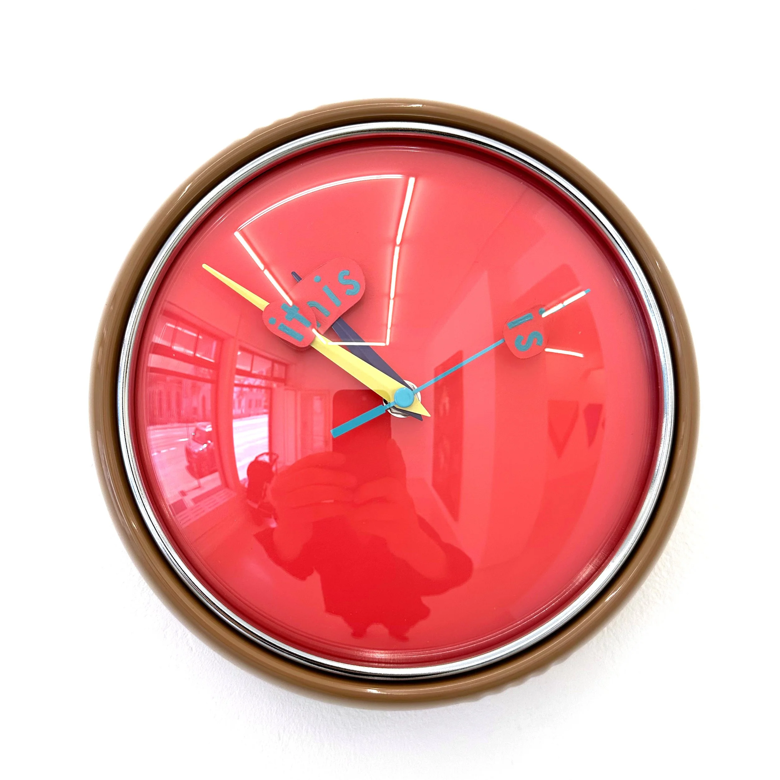 Jamie Isenstein, Mood Clock (This/is/it), 2022-23, aluminum, wood, acrylic, enamel, clock mechanism, plastic, 24.1 x 24.1 x 6.4 cm