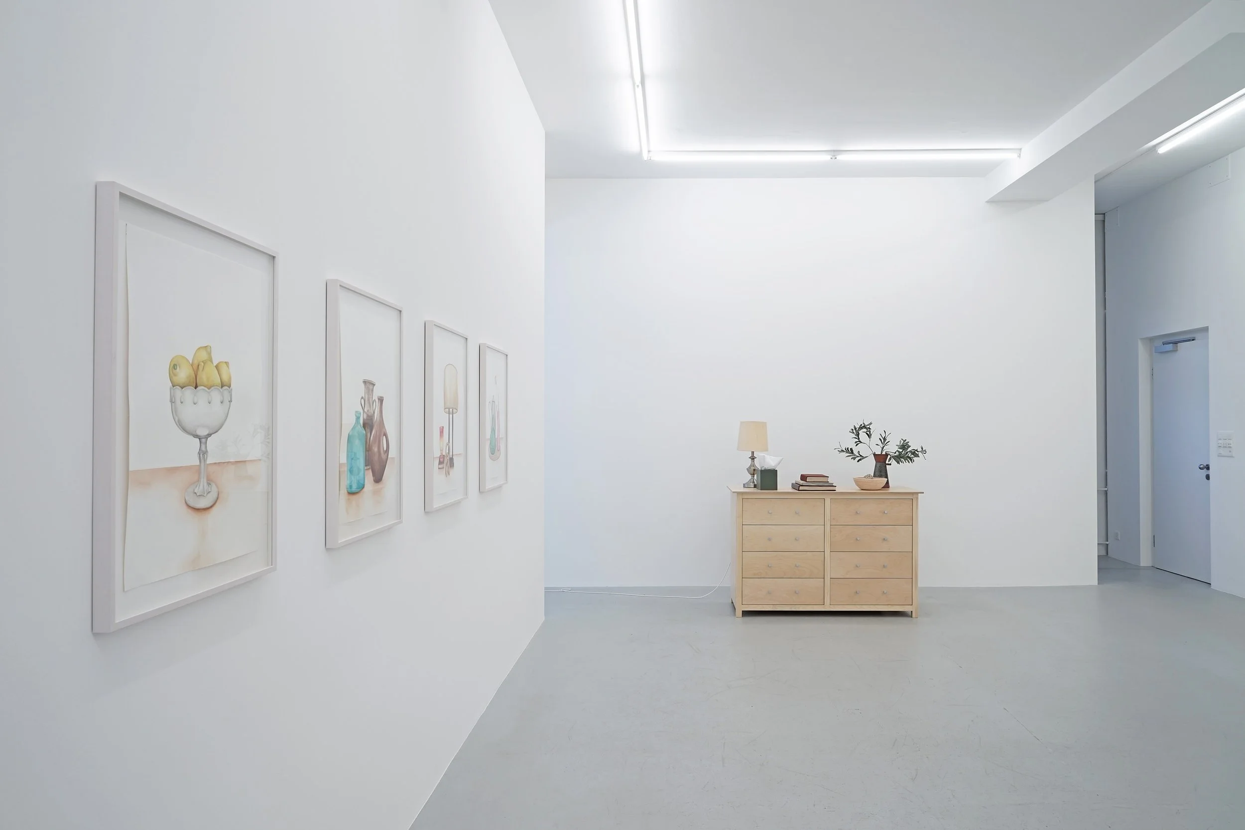 The Home Theater is complimented by six still life watercolors of objects found in actual staged homes for sale. In their presentation, the still lifes adopt stylistic characteristics of The New Objectivity movement. At first glance the they seem a bit sober, especially when viewed individually because objects used to enhance a property are often generic to appeal to the largest number of potential buyers. The watercolors resemble traditional still lifes, however, they take on a deeper meaning when you consider their source. Looking at them all together, their uniformity is strangely striking. When the subjects of the watercolors are compared to the objects on the chest of drawers, the subjects in the watercolors take on a performative quality. Three wall clocks with hands that end in two eyes and a mouth are the audience for the performance. The clocks change emotions as they tick, reinforcing the surrealist mood in the room.