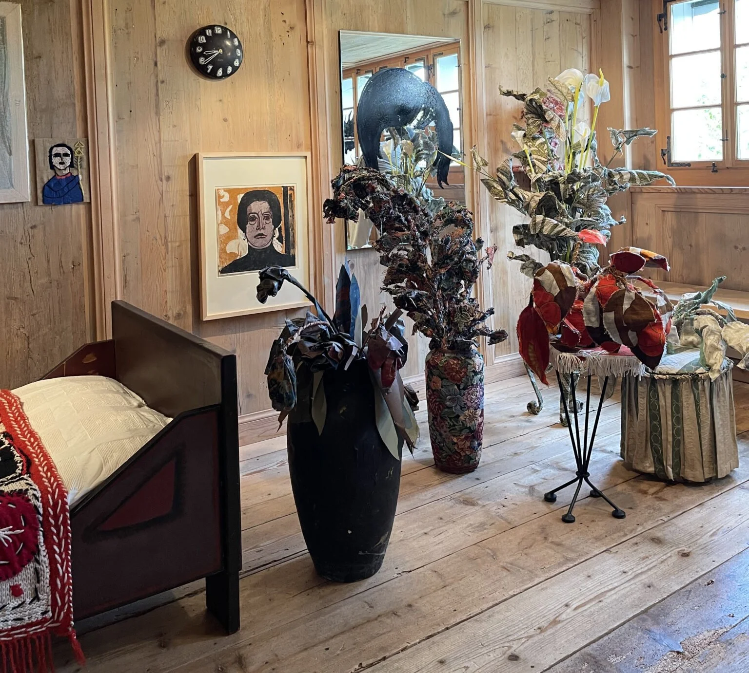 Mit grossem Gewinn bin ich zum Beispiel kürzlich nach Oetwil am See im Zürcher Oberland gefahren, wo das Orts- respektive Helen Dahm-Museum «Zwei Dahmen» zeigte, Helen Dahm (1878-1968) und Klodin Erb(*1963) im Dialog. Es gibt keine direkte Verbindung; zwischen den beiden Frauen liegen 75 Jahre. Und doch! Klodin Erb spricht von Helen Dahm als einer Schwester im Geist. Das meint vielleicht: Wir lassen uns nichts vorschreiben, nicht im Leben, nicht in der Kunst. Klar zeigt sich das in der ersten Hälfte des 20. Jh. anders als im späten 20sten und bis heute. Aber Klodin Erb ist vor allem auch in der Inszenierung so auf «ihre Schwester» eingegangen, dass ein Ganzes entsteht, das berührt. Helen Dahm hat z.B. gerne die Fenster bemalt; also tat es ihr Erb nun nach mit zwei grossen Flügeln. Und sie fand bei sich im Archiv wunderbare Stoff-Plastik-Blumensträusse (1999) und gesellte sie zur (uralten) «Vase mit Papierblumen» von Dahm. Dies vor einem Selbstbildnis von Dahm und einem Spiegel mit einer Monotypie ihrer selbst (aus der Serie der «Avatar») an der Wand.