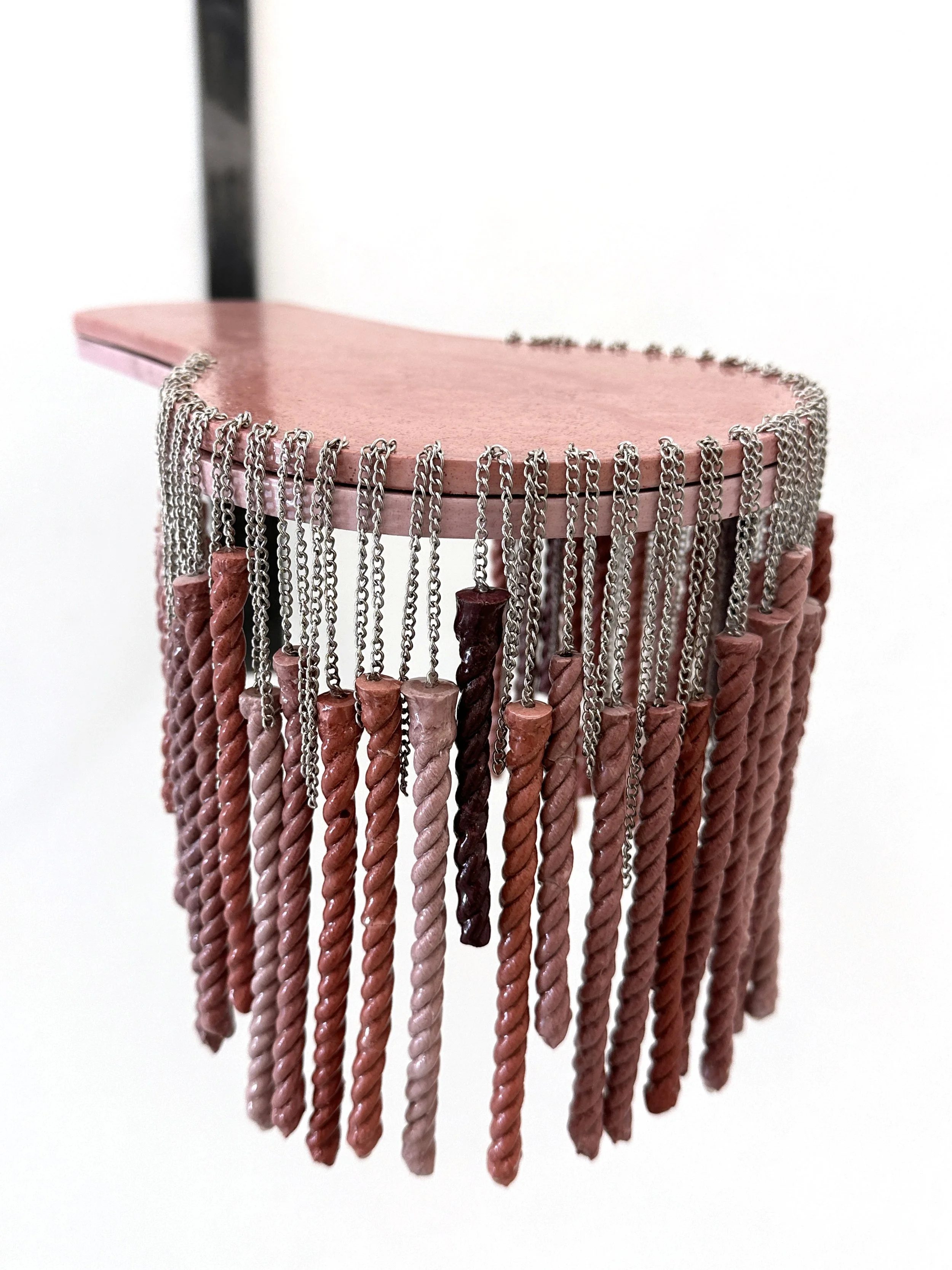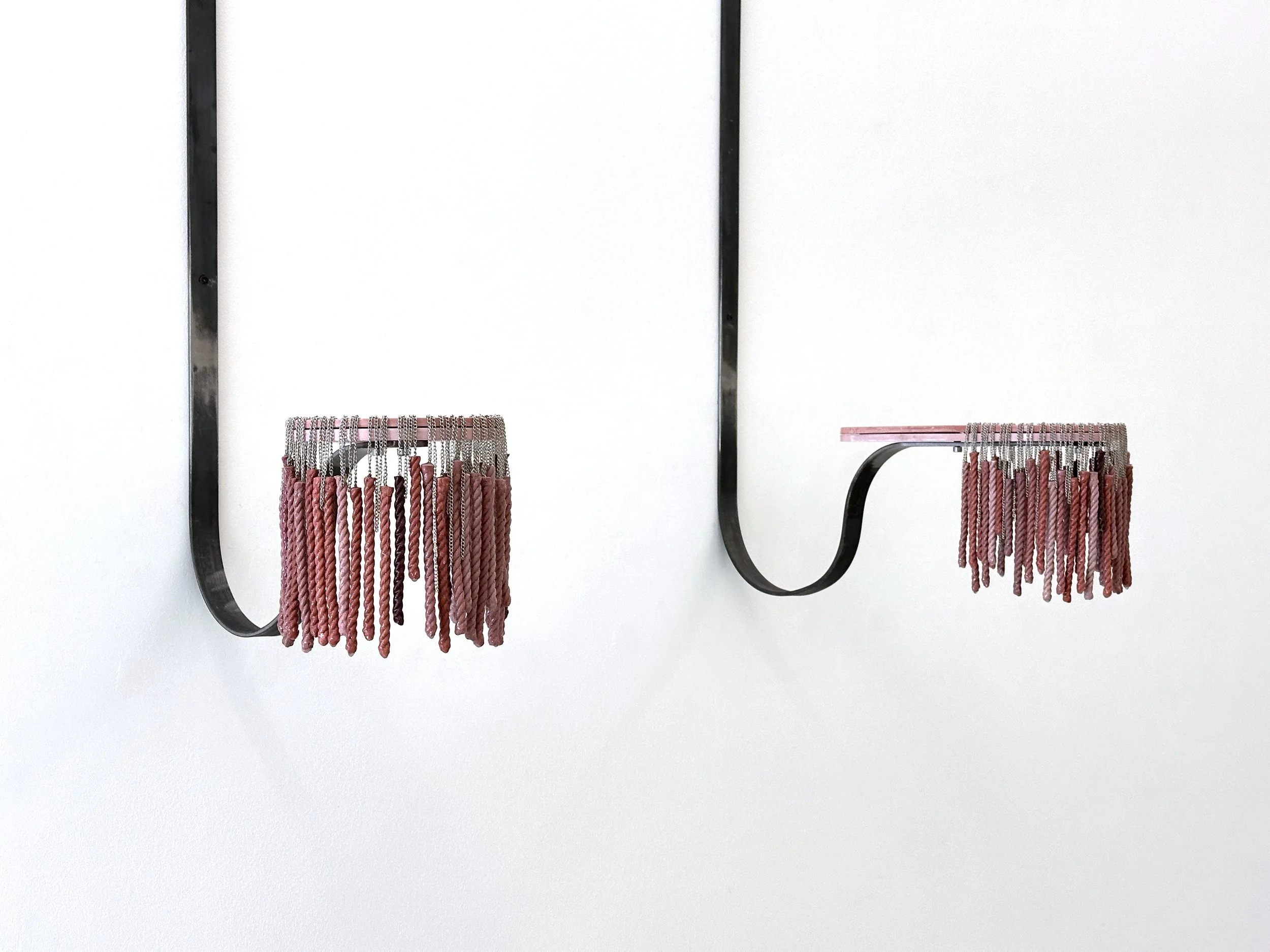 This becomes particularly visible in the sculpture Amplification in the second room. A person is indicated solely by two fringed epaulettes attached to two symmetrically arranged rails. Fringed epaulettes typically elevate a male figure into a specific social position; for women, these shoulder pieces are primarily used as striking fashion accessories. This work is a reference to Pini’s exhibition at the Museo Vincenzo Vela, where she engaged with a major work by Vela: an imposing equestrian statue of Charles II, Duke of Brunswick, using it as a starting point to reflect on symbolism, mutability, masculinity and materiality.