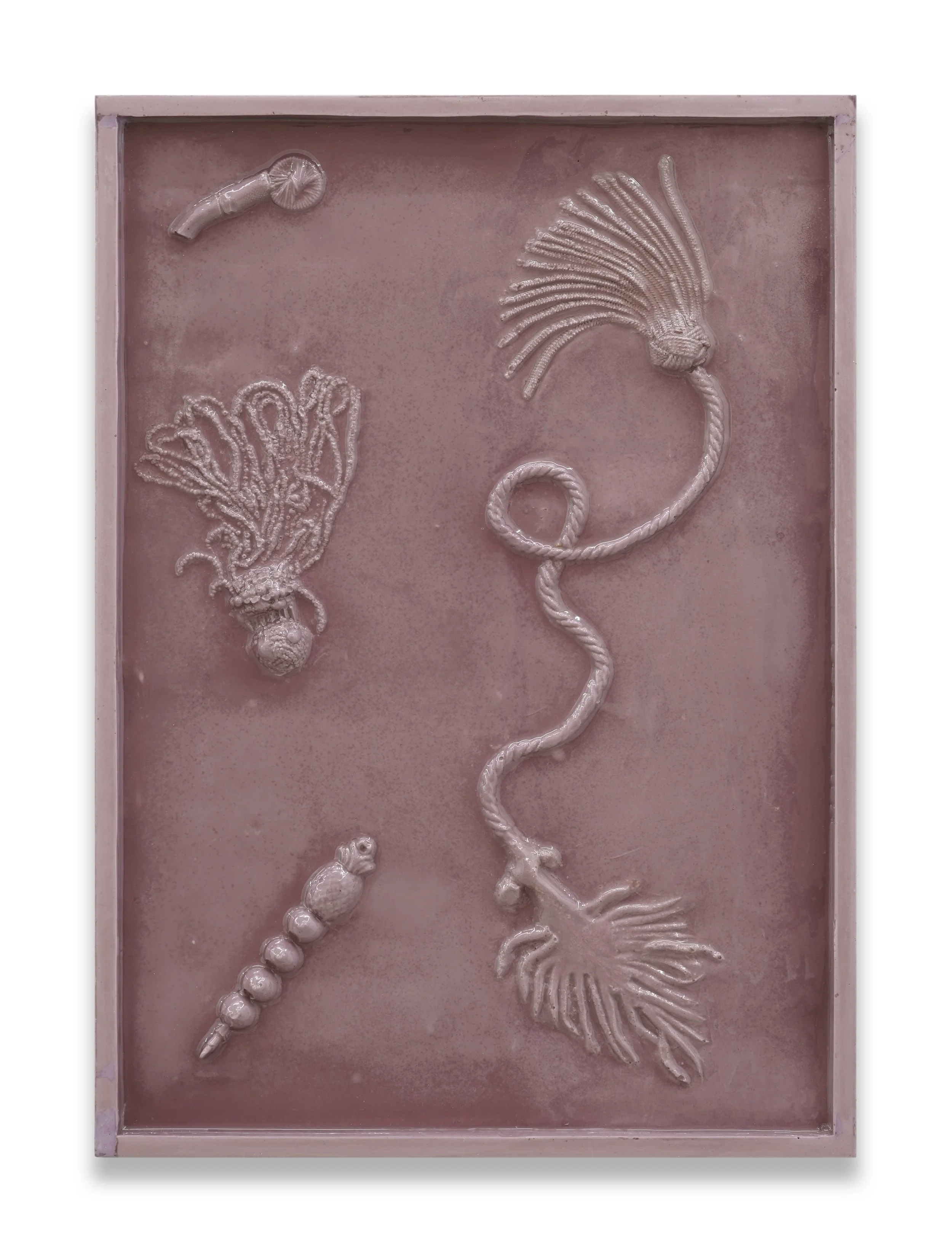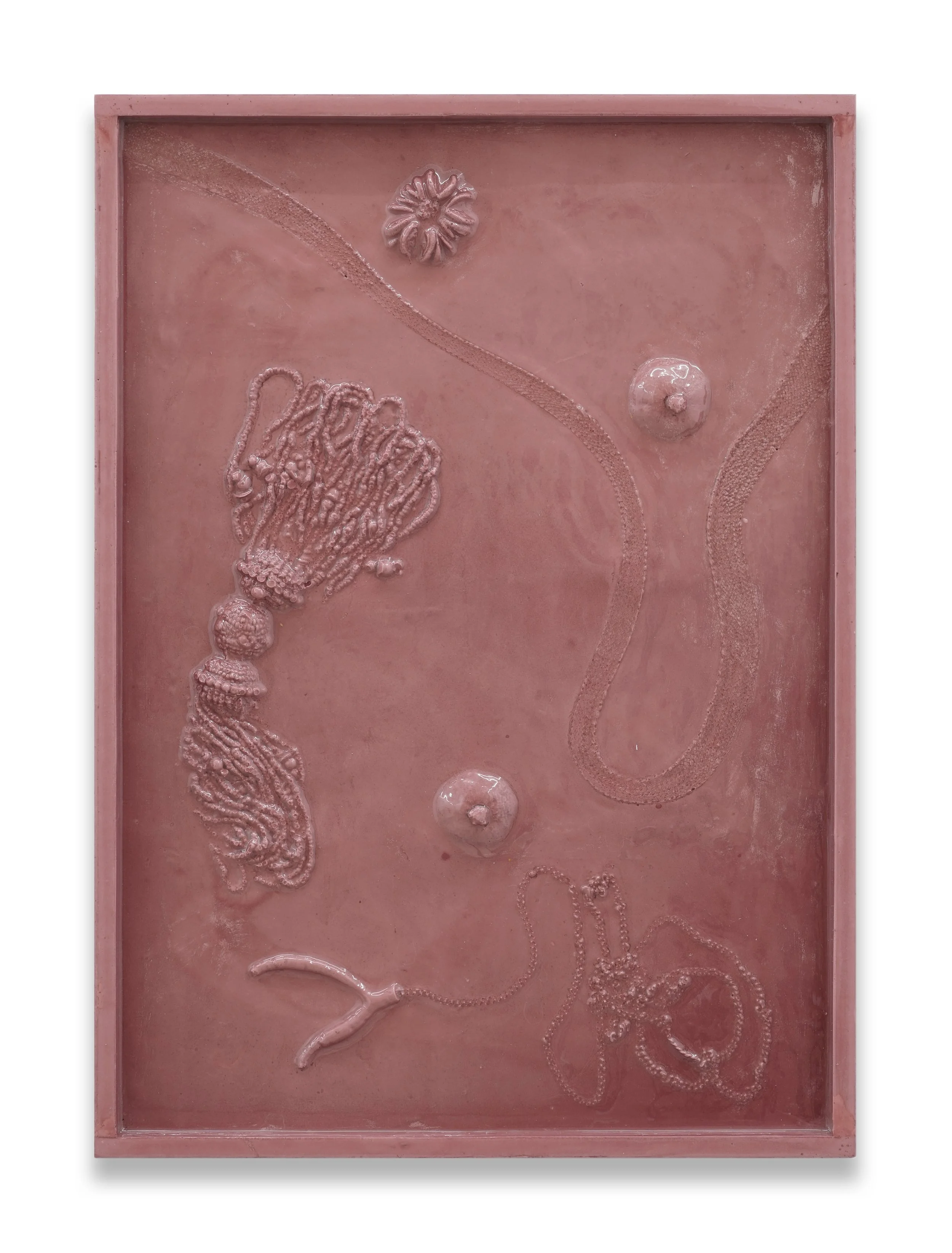 Following the first series, the second group of reliefs, At the Tip of the Tieback, continues the dialogue with nature while heightening the theatrical aspect of the exhibition. This series was created in early 2026 during Pini’s residency at the Bogliasco Center in Liguria. While Pini again uses vegetation from the immediate surroundings – in this case, the gardens of the Bogliasco Center – she enriches these compositions with new narrative fragments: small figurines and curtain tassels. A significant novelty here is the inclusion of the frame as an integral part of the works. As a result, the reliefs transform into independent stage elements that scenographically complete the bodies implied in the space.