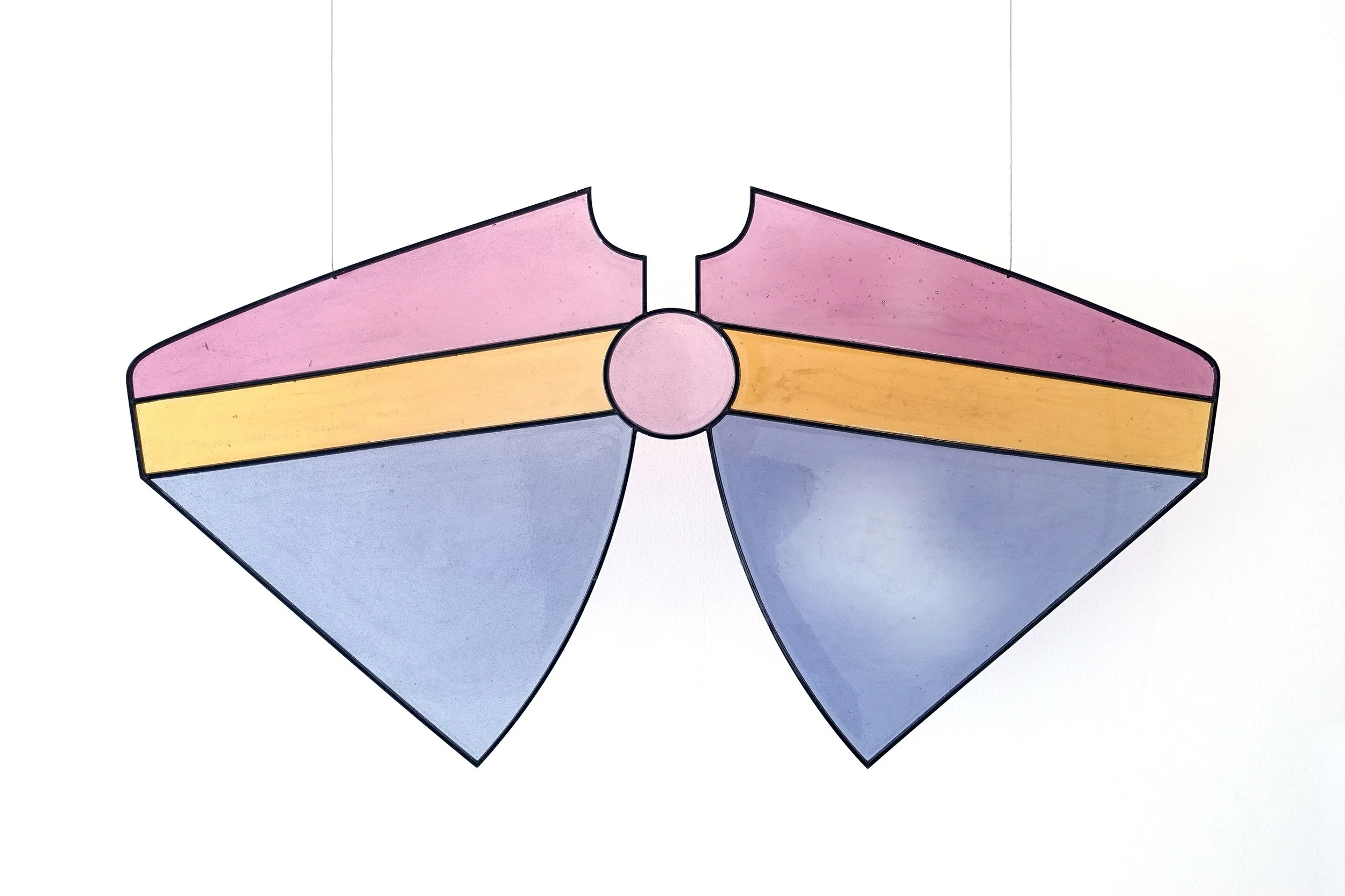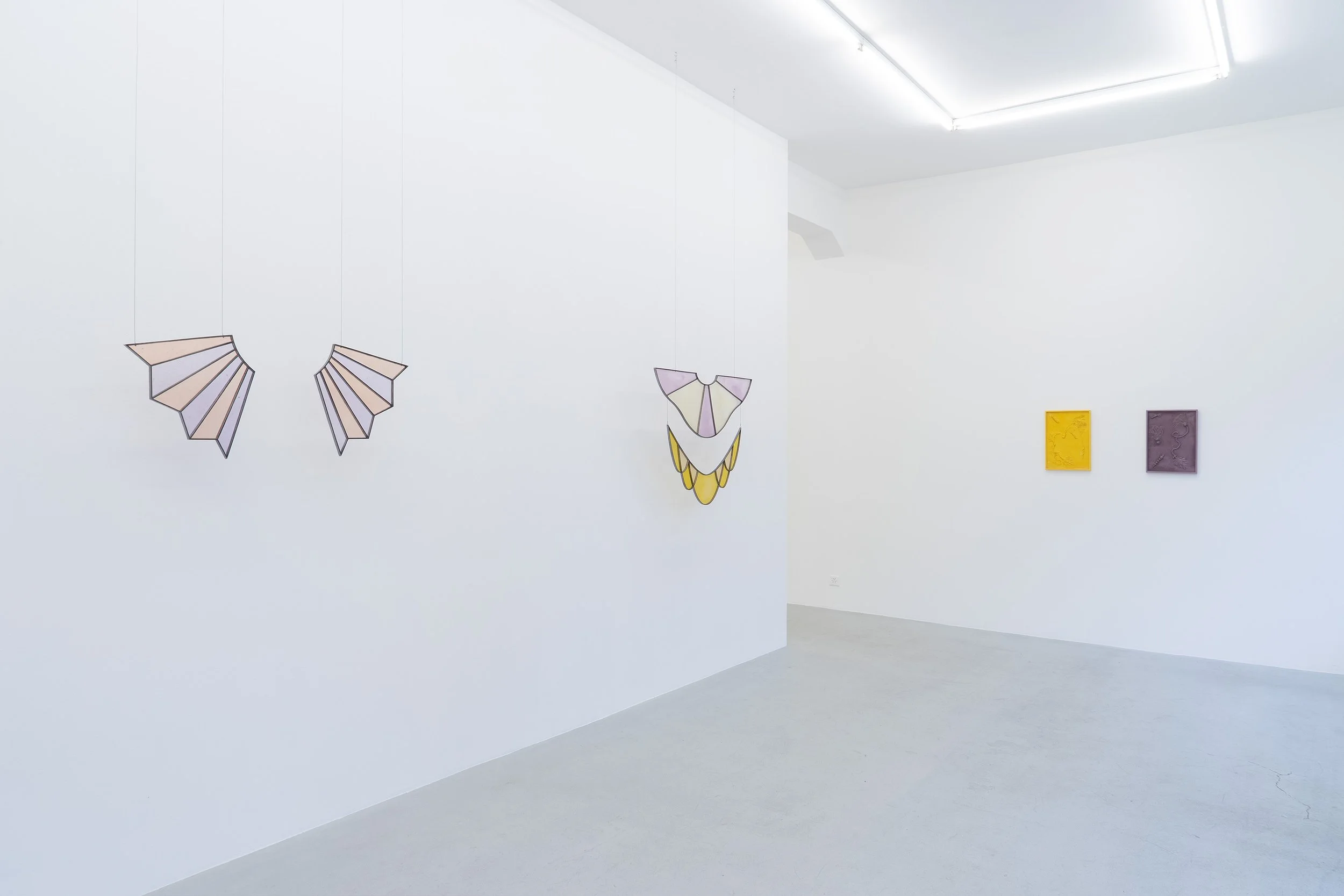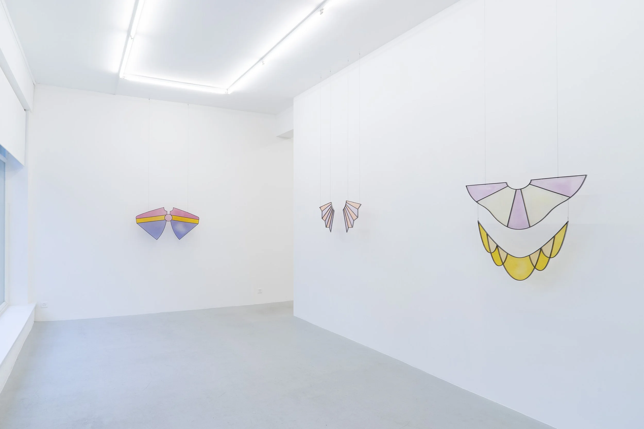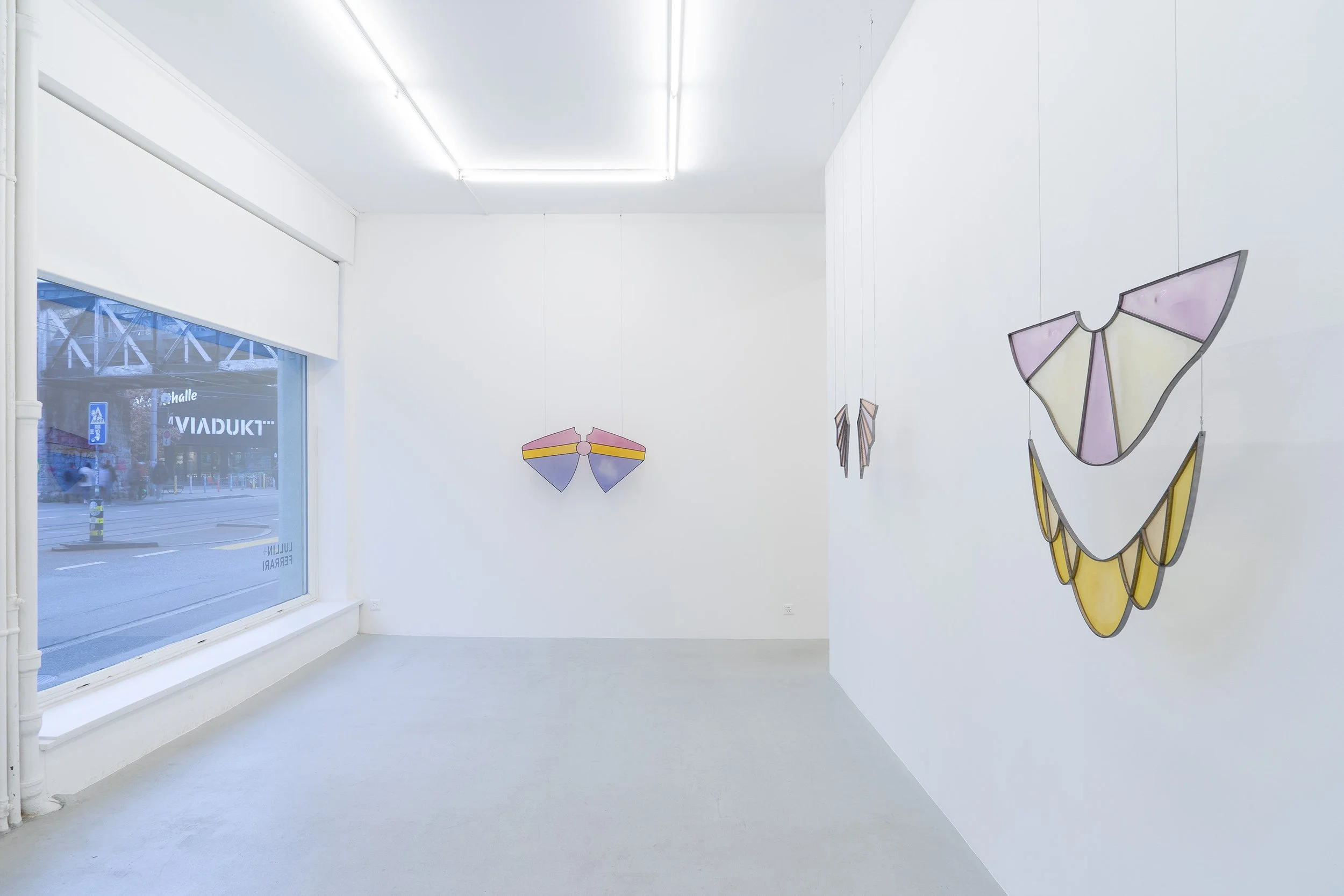 In the gallery exhibition Décorps, Pini focuses again on sculpture, photography, and relief. The title defines the semantic field of the show: the coined word "Décorps" refers both to décor (ornamentation, set dressing) and corps (the body). Pini occupies the first room of the exhibition with a series of metal works with resin cast inside titled Autour du cou à la hauteur des yeux (Around the neck at eye level). By hanging the sculptures at an exaggerated shoulder height and employing strict axial symmetry, Pini references jewellery and costume elements: collars and necklaces. These are adornments – perhaps accolades – for the absent figures who might wear them. The formal vocabulary draws from Art Nouveau and early 20th-century glass art. The translucent colours of the objects, which hang at a distance from the wall, lend them a floating lightness. Their placement creates the illusion of bodies; in Pini’s work, the absent body is always implied and part of the thought process.