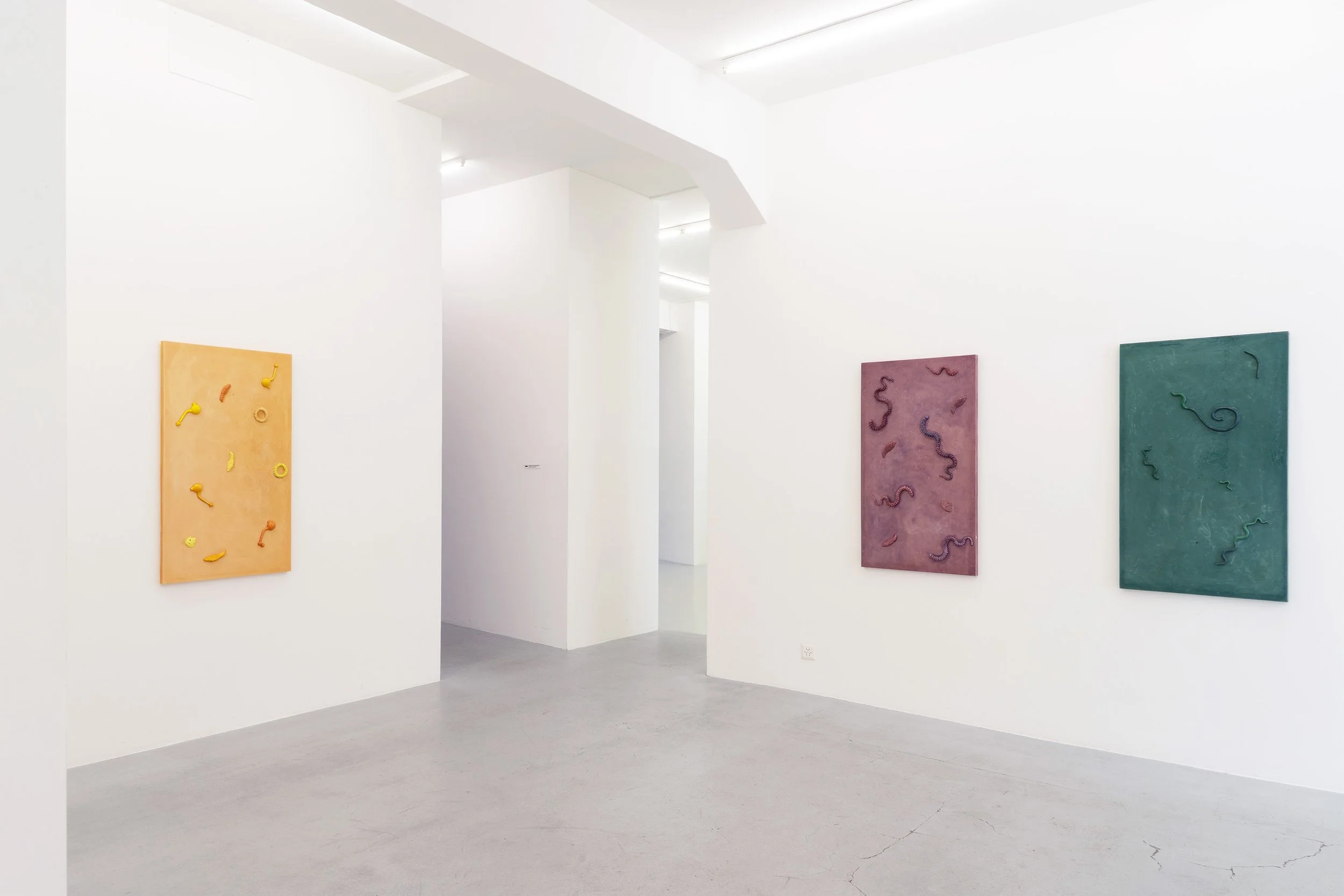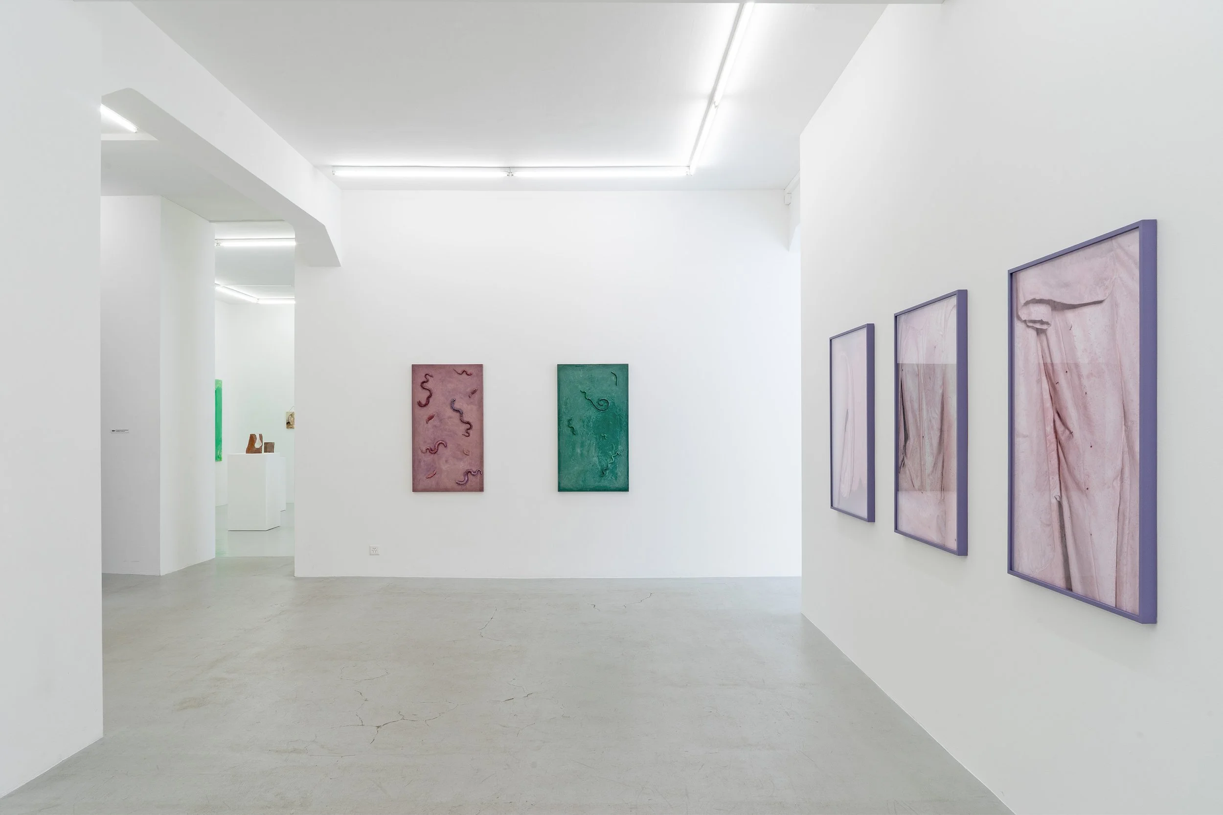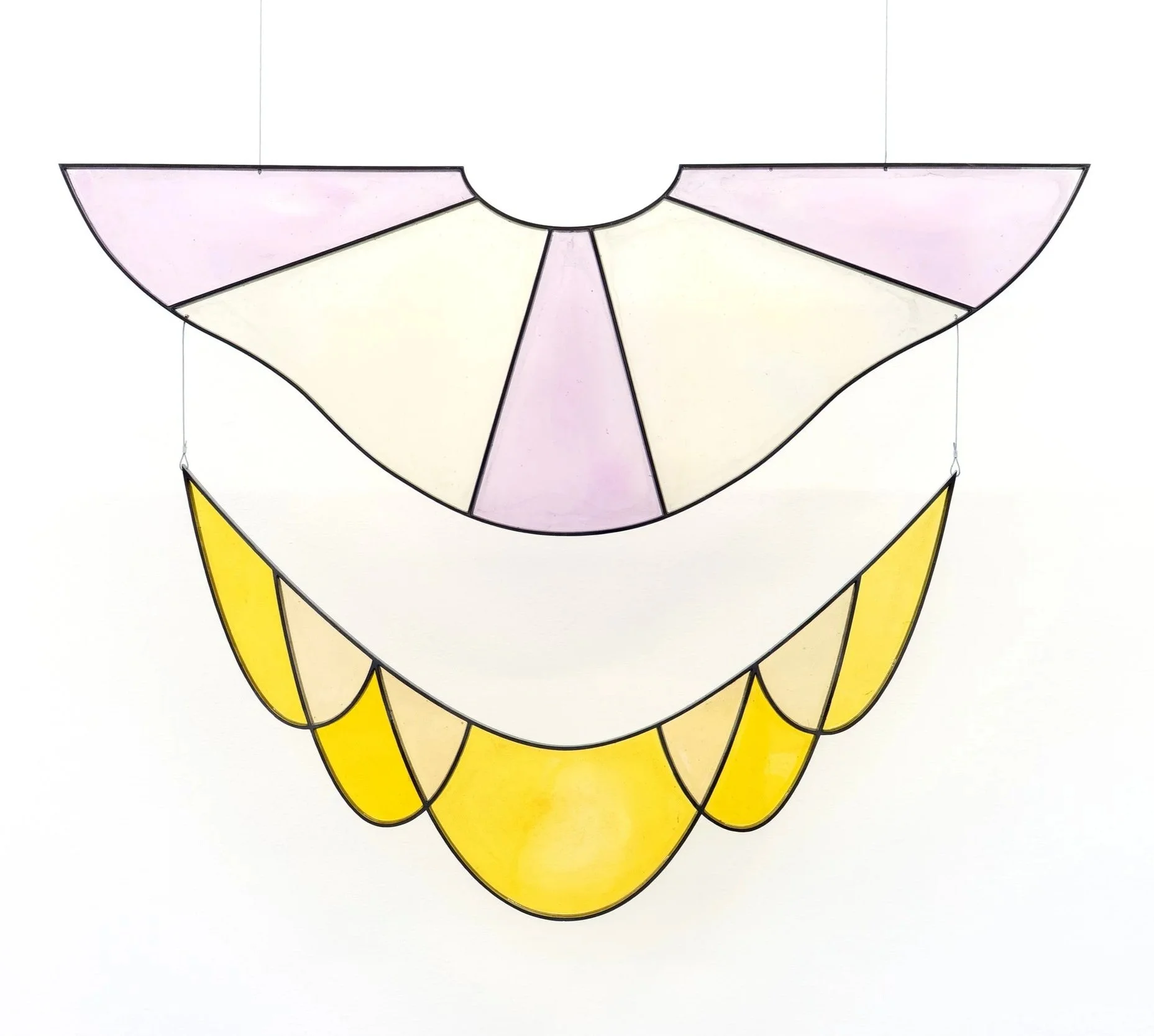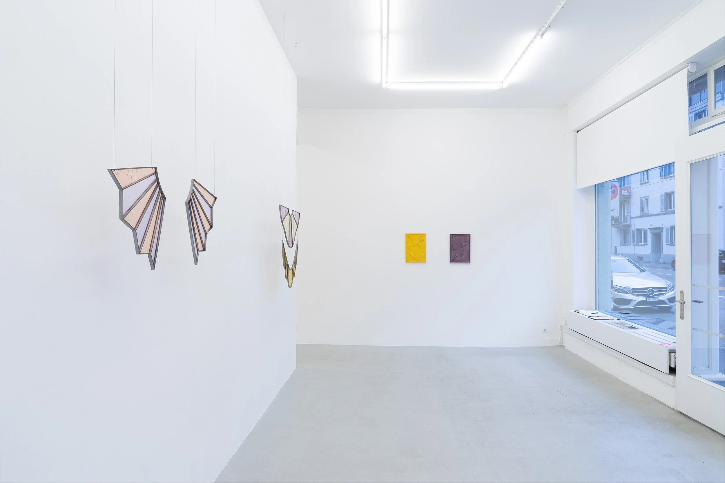 In the gallery exhibition Décorps, Pini focuses again on sculpture, photography, and relief. The title defines the semantic field of the show: the coined word "Décorps" refers both to décor (ornamentation, set dressing) and corps (the body). Pini occupies the first room of the exhibition with a series of metal works with resin cast inside titled Autour du cou à la hauteur des yeux (Around the neck at eye level). By hanging the sculptures at an exaggerated shoulder height and employing strict axial symmetry, Pini references jewellery and costume elements: collars and necklaces. These are adornments – perhaps accolades – for the absent figures who might wear them. The formal vocabulary draws from Art Nouveau and early 20th-century glass art. The translucent colours of the objects, which hang at a distance from the wall, lend them a floating lightness. Their placement creates the illusion of bodies; in Pini’s work, the absent body is always implied and part of the thought process.