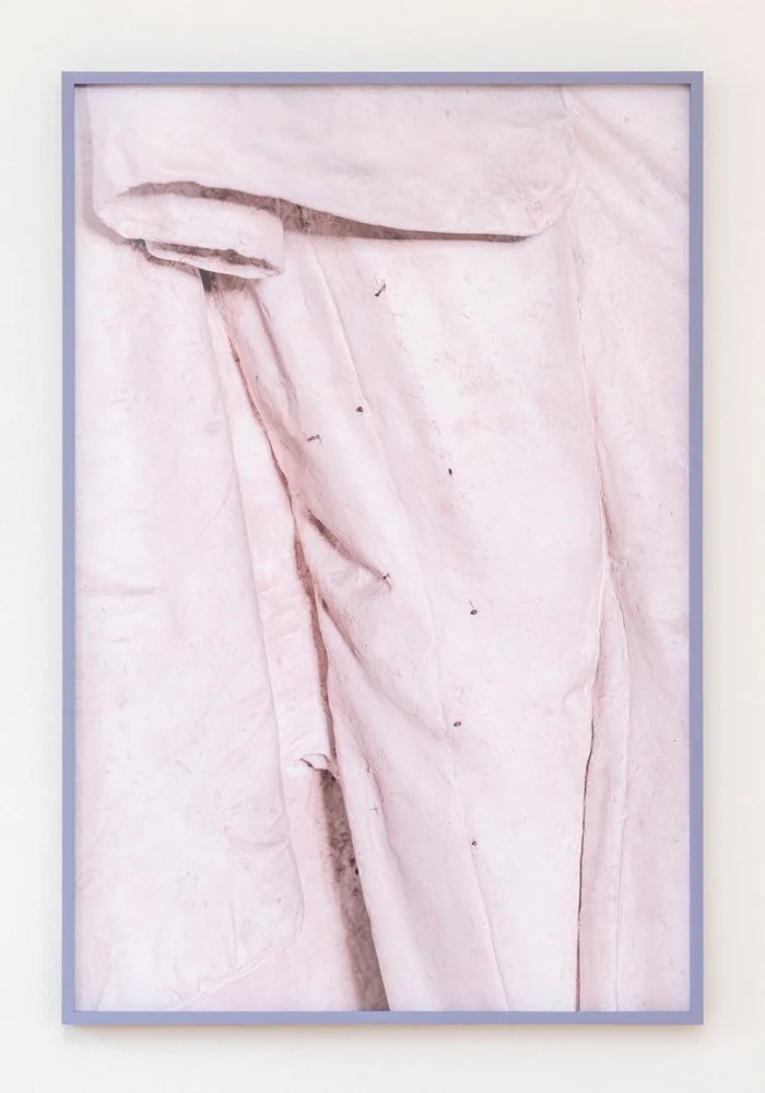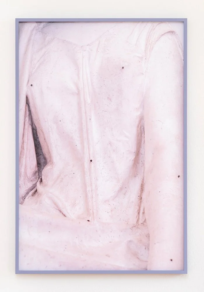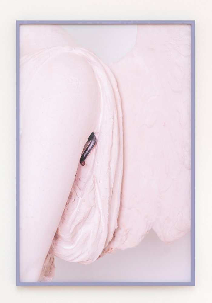 To the left of Amplification hang three photographs depicting details of plaster sculptures from the Museo Vincenzo Vela. In this photographic series, Displaced Fractures, Pini directs her attention toward the fine, often overlooked details of the plaster figures. While this group of works refers explicitly to Vela’s sculptures, closer inspection reveals foreign bodies – hooks, nails, or wire structures. These are not merely functional elements, but silent witnesses to materiality, vulnerability, and construction. On one hand, they make the manual process of sculpting visible; on the other, they become symbols of physical frailty and psychological dislocation. Pini thus references a tradition in modern sculpture that understands the body not as a whole, but as a fragmented and reconstructed entity. Simultaneously, these works reverse the logic of Pini’s installations: they capture the representation of a body rather than creating a physical body in space, rendering the fragmentation and decorative aspects of the body both more mystical and more visible.