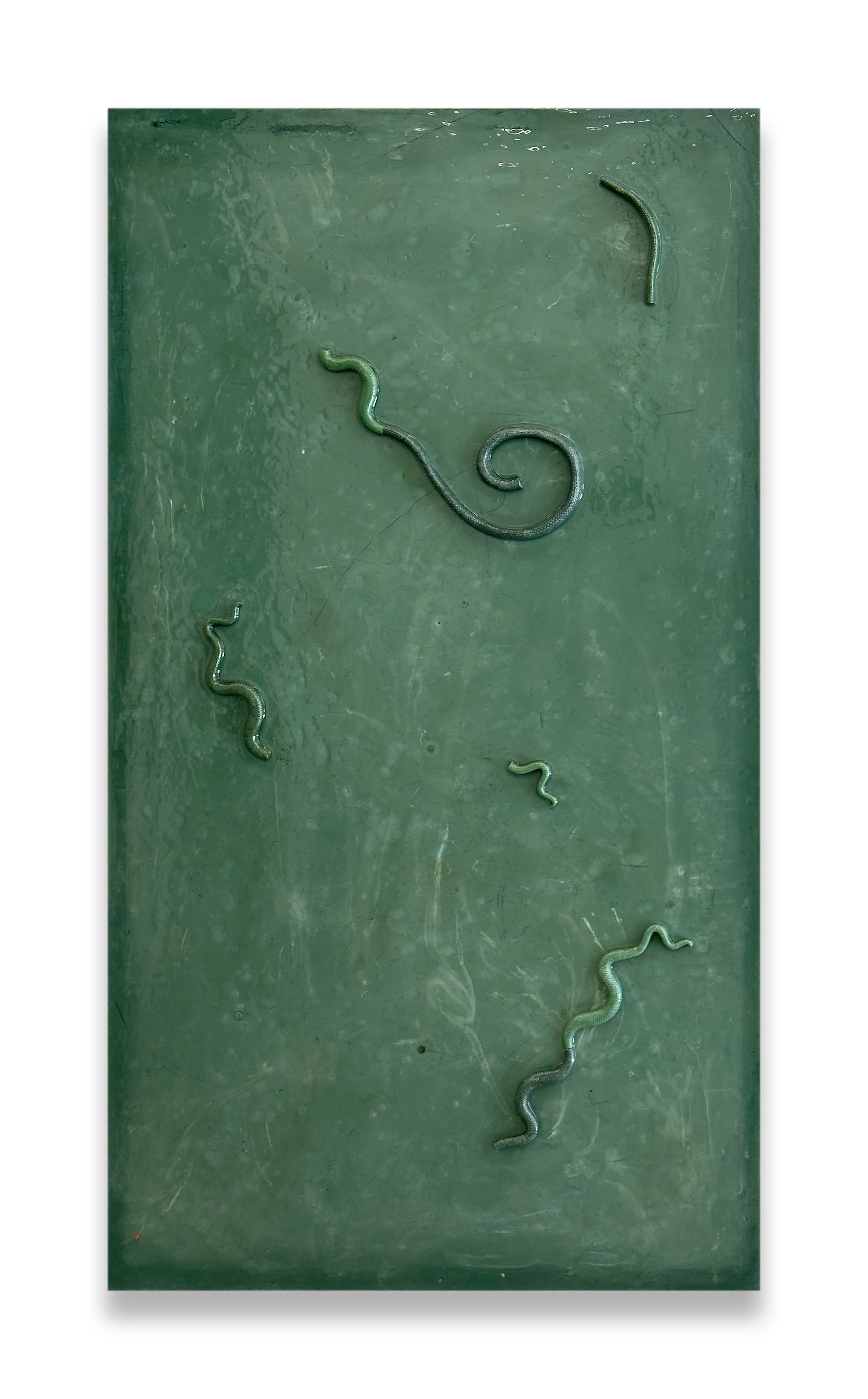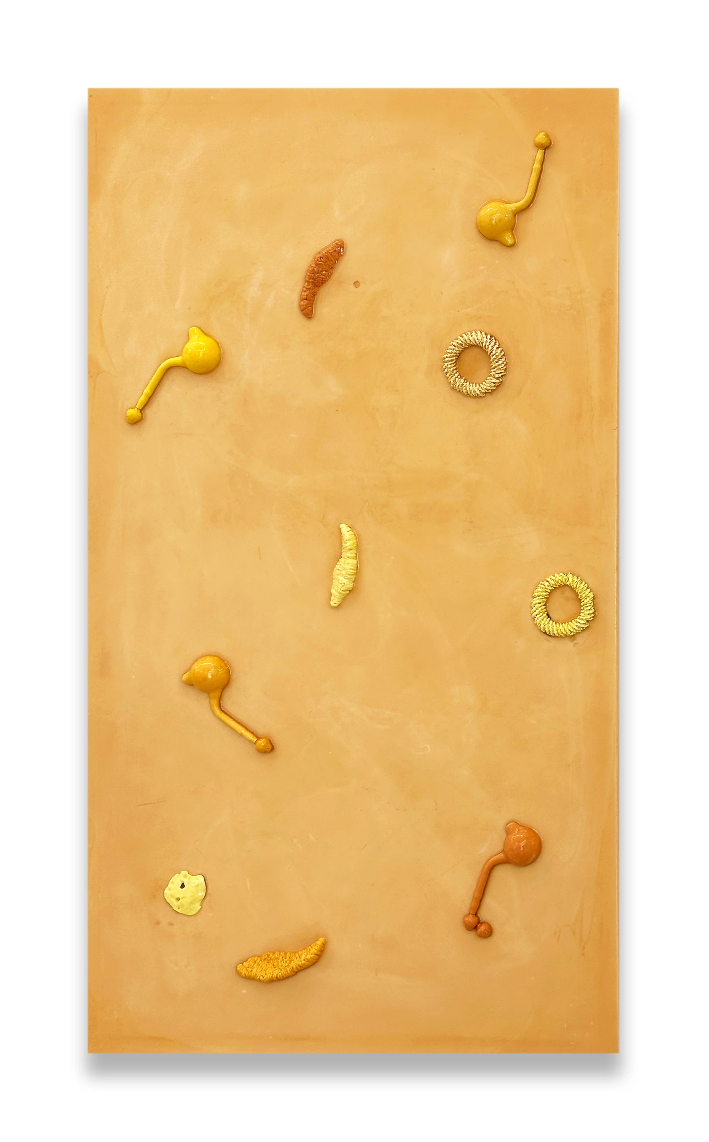 Two series of reliefs, a practice the artist has developed over years, complete the exhibition. The large-scale works are dedicated to the vegetation in the garden of the Museo Vincenzo Vela. These reliefs include motifs from the surroundings without reproducing them naturalistically, combining them with objects from the artist’s archive. Pini creates complex compositions and expands on her own mythology—returning to objects such as grapefruit pieces, lemons, or dragons while adding new narratives to her vocabulary. Through the mixture of found objects and artist-created ingredients, the audience is left uncertain about the origin, meaning, and purpose of the elements, invited instead to interpret what they see.