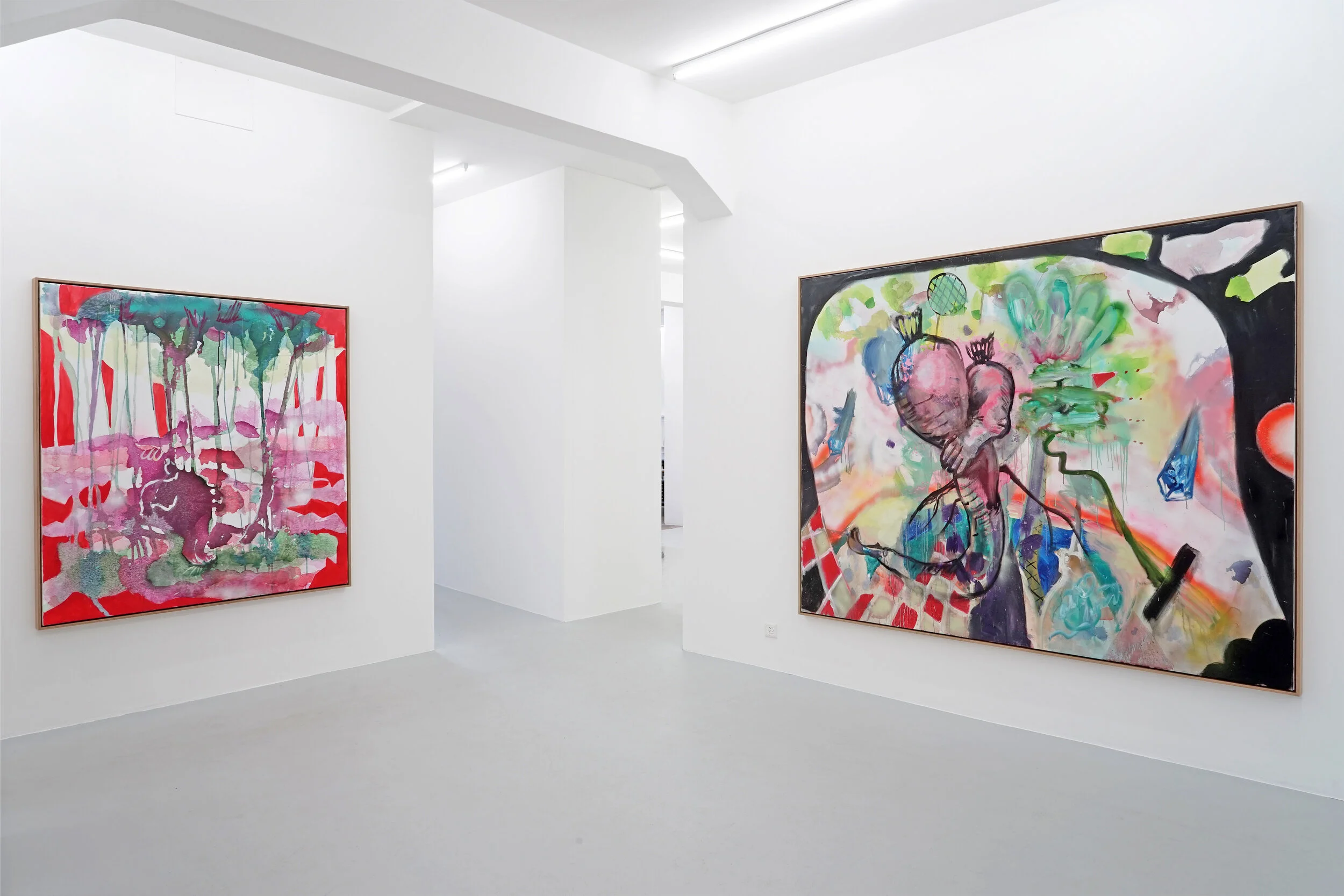 In her second solo exhibition at the gallery, Klodin Erb pulls out all the stops of her painting skills. She populates the gallery's new space with two groups of works that differ in form, but both express the artist's engagement with the current state of our ecosystem. Spread across the front gallery space are eight large-format paintings created in 2020-21, which she describes as events. In the rear garage space she presents a second group of smaller paintings. The ambivalence of creative power and vulnerability is a basic idea of the exhibition, which comes to bear in different forms in both groups of works.