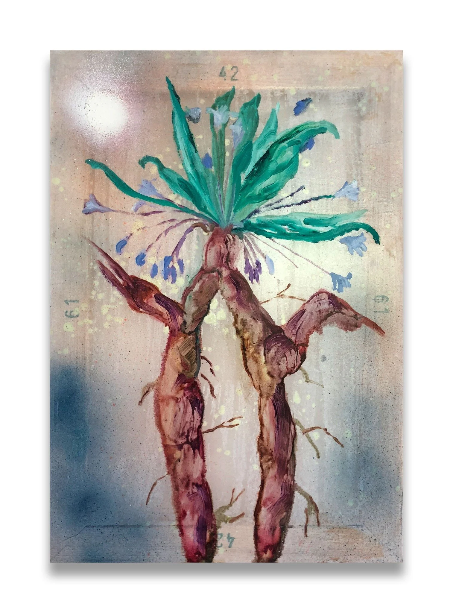 In the back room of the extended gallery, Klodin Erb is showing a new group of smaller works called Forces and Juices, which bundle together questions of the connection between man and nature as if in a burning mirror. Due to their small format, they are particularly well suited to transporting certain feelings. By depicting roots with human forms, Klodin Erb congenially symbolises the connection between man and nature and symbolically depicts the threatening uprooting of man from nature. Klodin Erb developed her own technique for this group of works. She uses Japanese paper, which she applies to a chassis with fish paste and then paints over with emulsion paint. Then she begins the painting process with very fluid, pure linseed oil. Since the paint does not dry but flows, she has to work quickly and display all her painterly bravura. The figures of this holistic approach are amazing, invite a smile and reveal an artistic universe all their own.